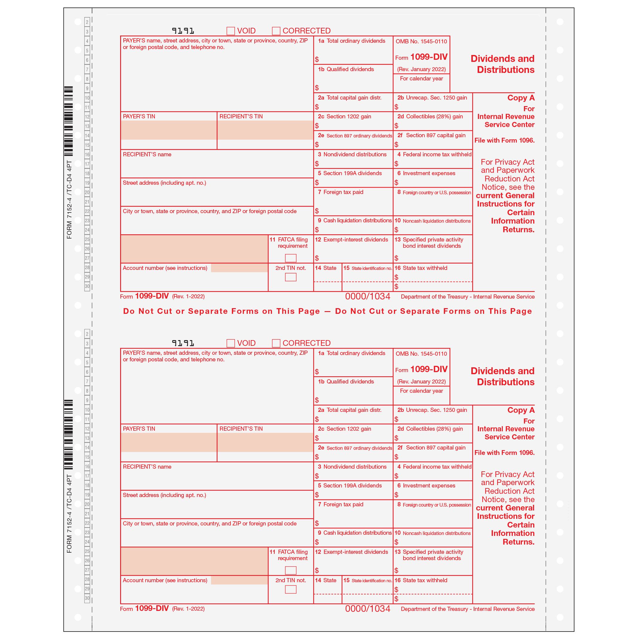 Dividends and Distributions. Your typewriter or pin-fed printer will print all copies at the same time. Mail federal copies in a batch to the IRS. Separate and mail recipient copies in compatible window envelopes. Order by number of forms, not sheets.