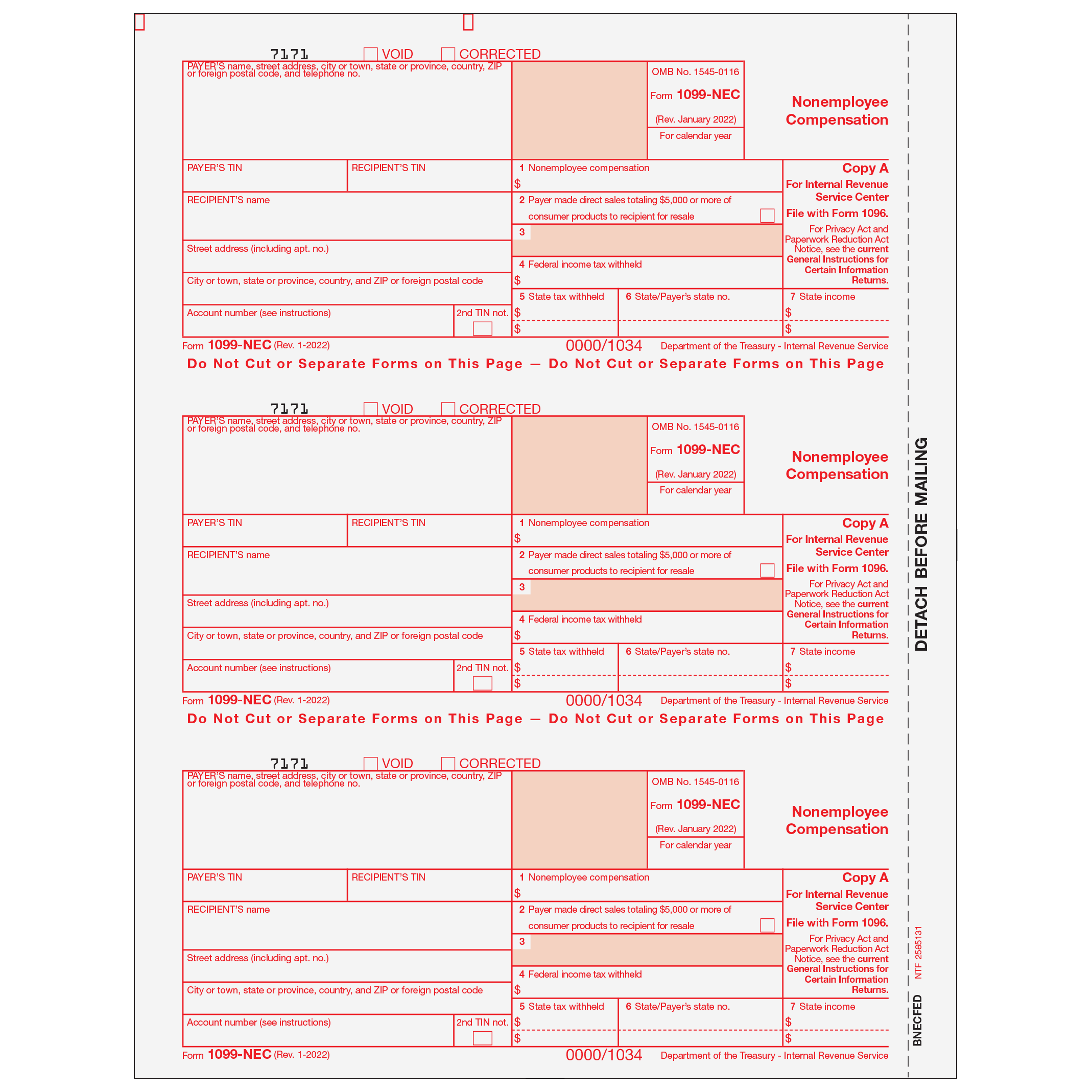 Non-Employee Compensation. Use Form 1099-NEC Copy A to print and mail payment information to the IRS. 1099-NEC forms are printed in a 3-up format, on 8 1/2" x 11" paper with 1/2" side perforation, and are printed on 20# laser paper. Mail as a batch to the IRS. Order by number of forms, not sheets.