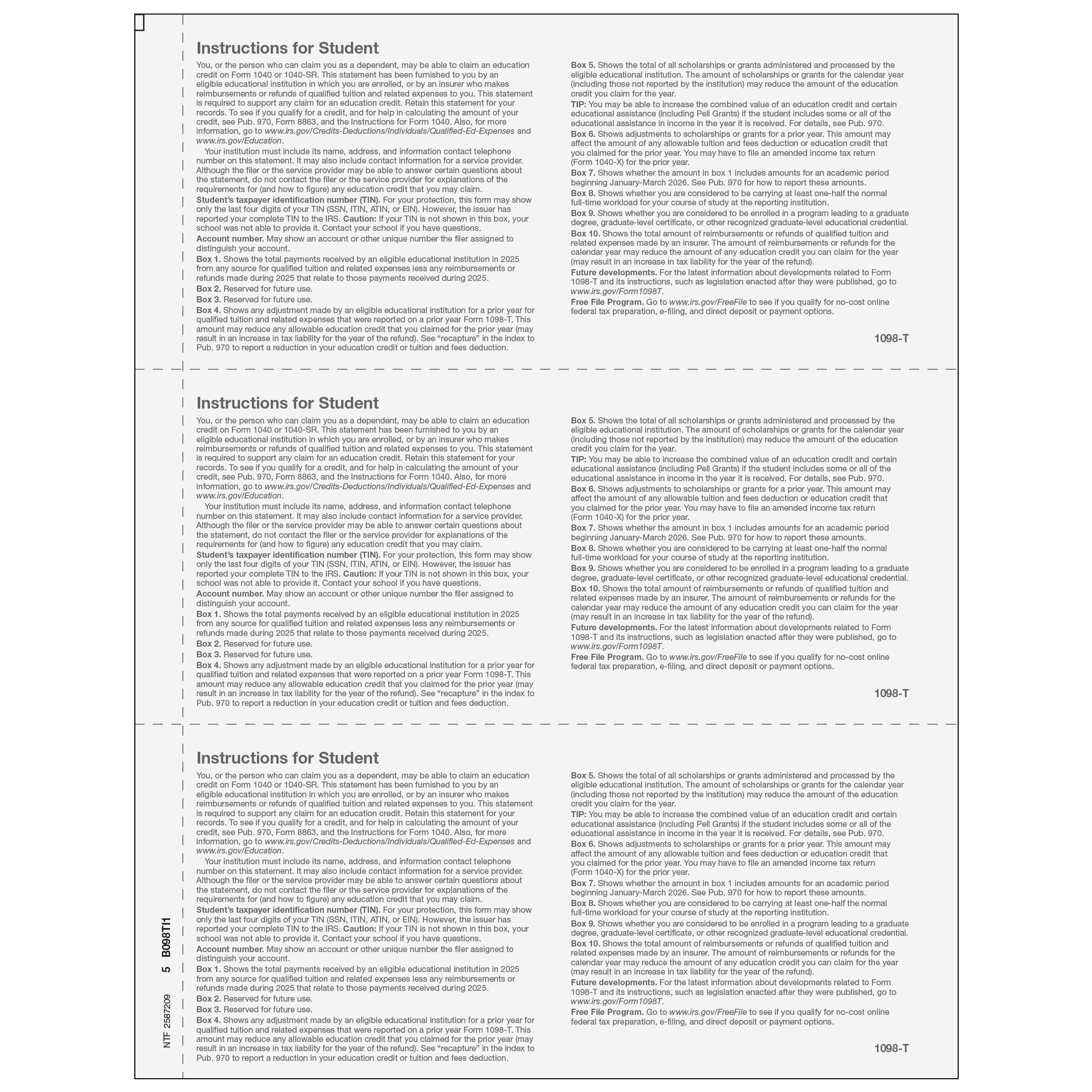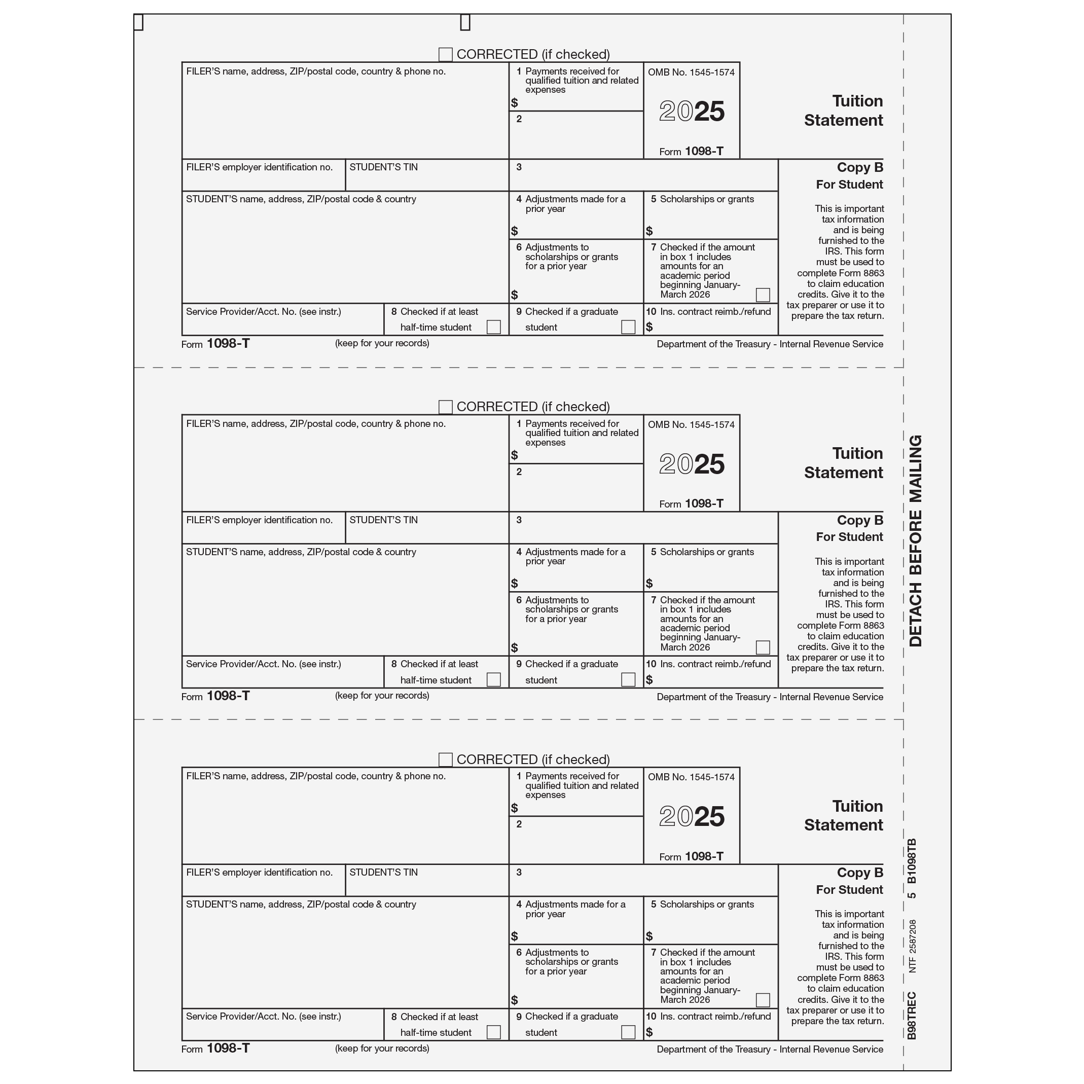 Tuition Statement. Use the 1098-T Copy B to print and mail tuition information to the student for preparation of their tax return. Forms are 3up on an 8 1/2 x 11" sheet with a 1/2" side perforation and are printed on 20# laser paper. Order the quantity equal to the number of students for which you file.