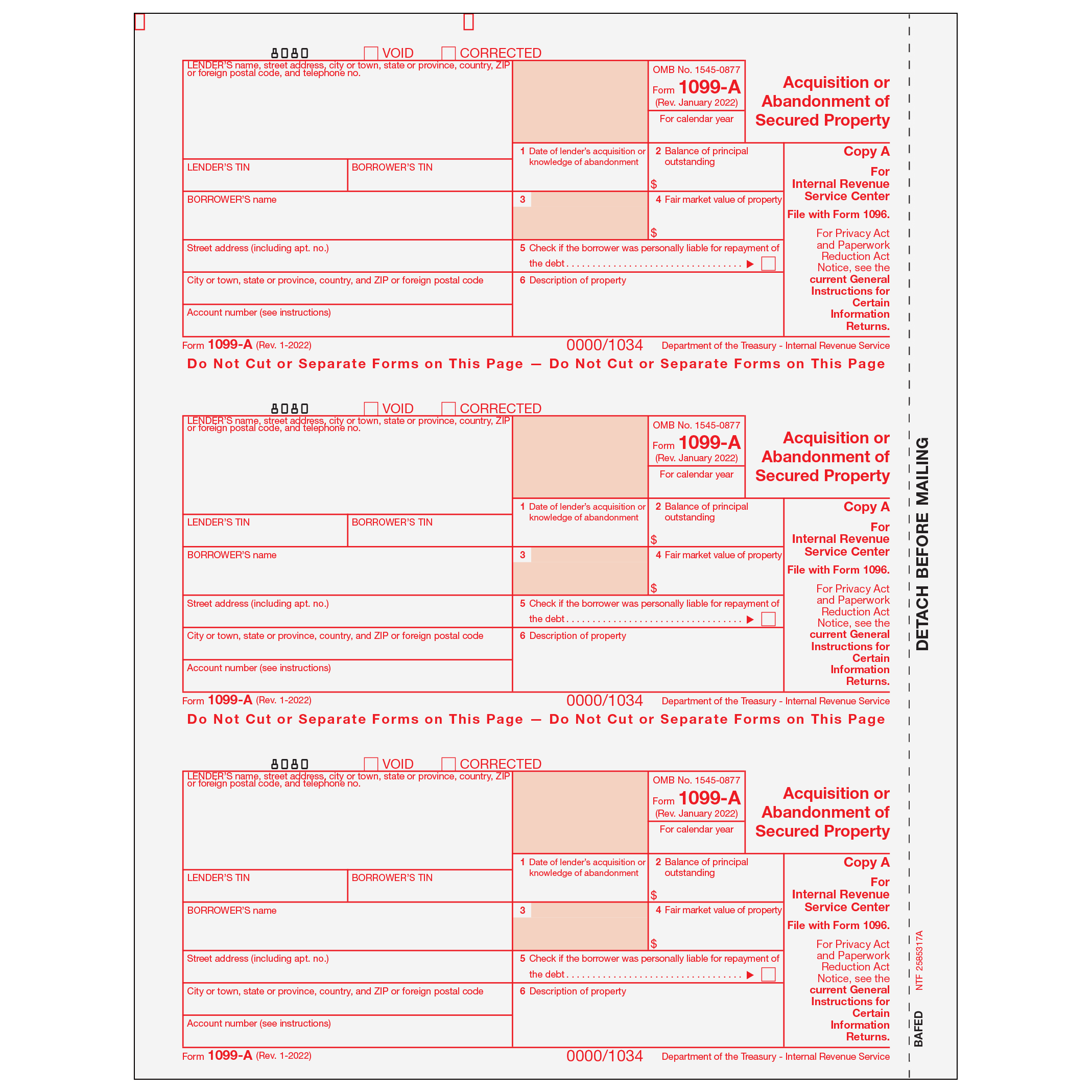 Acquisition or Abandonment of Secured Property. Use Form 1099-A Copy Ato print and mail payment information to the IRS. 1099-A Forms are 3-up on an 8 1/2 x 11" sheet with a 1/2" side perforation and are printed with required scannable ink on 20# laser paper. Mail as a batch to the IRS. Order by number of forms, not sheets.