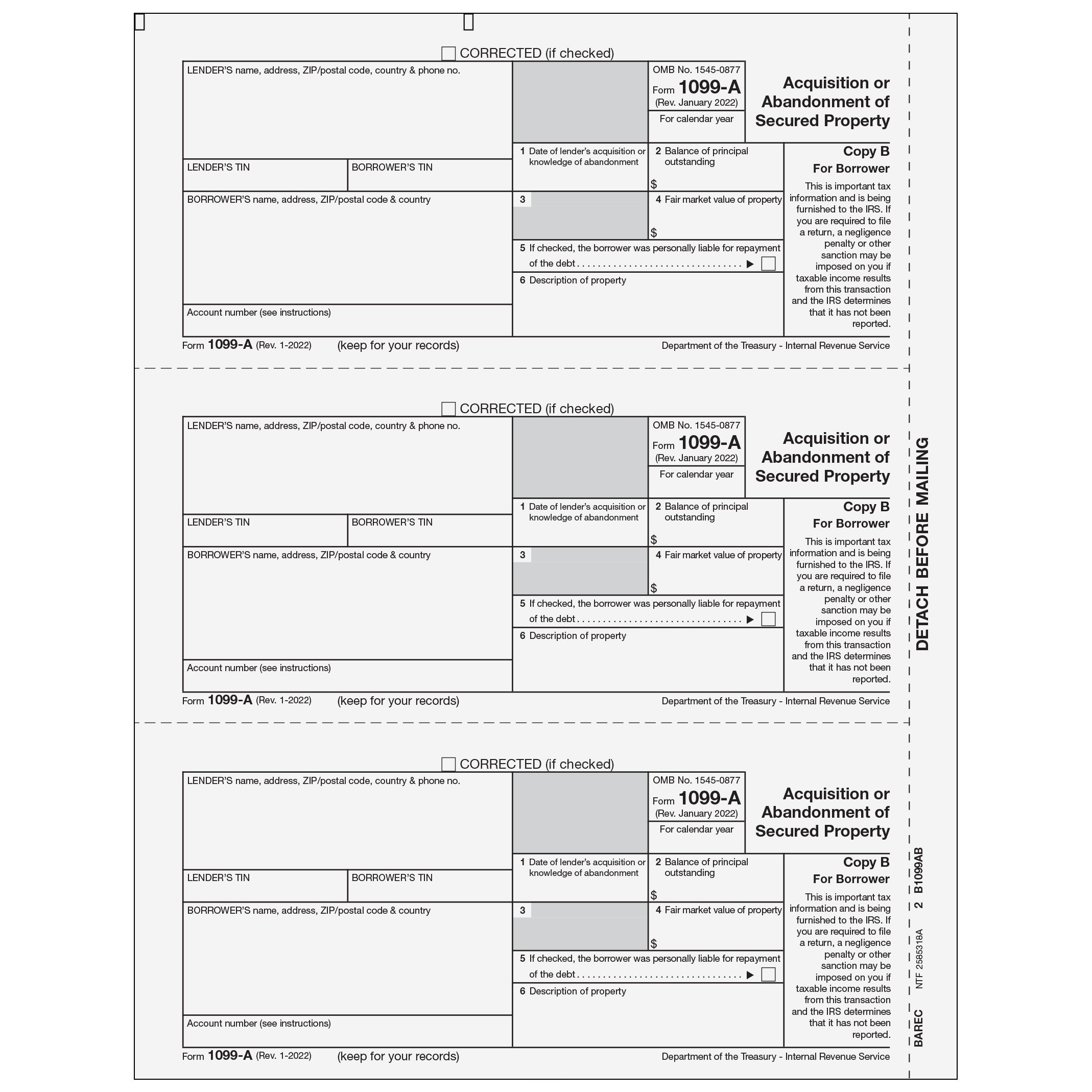Acquisition or Abandonment of Secured Property. Use Form 1099-A Copy B to print and mail payment information to the Borrower. 1099-A Forms are 3up on an 8 1/2 x 11" sheet with a 1/2" side perforation and are printed on 20# laser paper. Mail borrower copies in compatible window envelopes. Order by number of forms, not sheets.