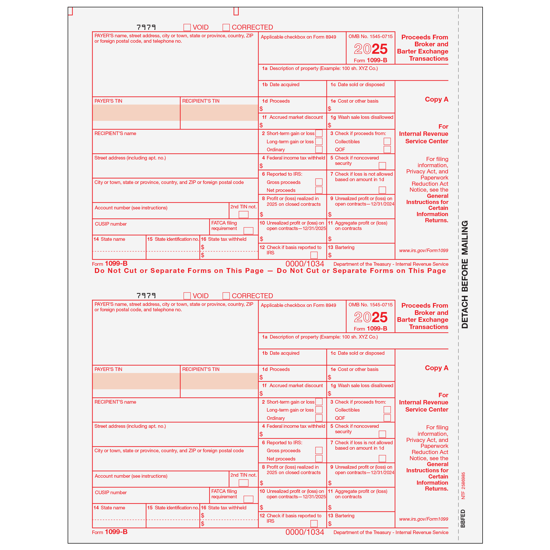 Proceeds From Broker and Barter Exchange Transactions.UseForm 1099-B Copy Ato print and mail payment information to the IRS. 1099-B Forms are 2up on an 8 1/2 x 11" sheet with side perforation and are printed with required red scannable ink on 20# laser paper. Mail in a batch to the IRS. Order by number offorms, notsheets.