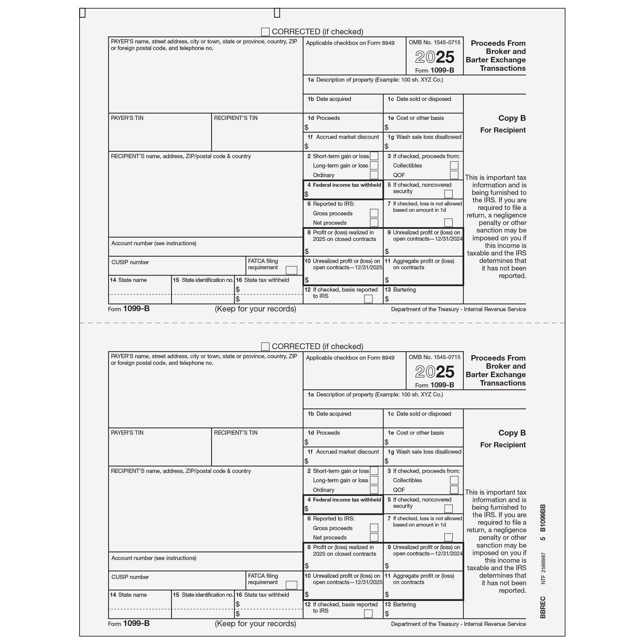Proceeds From Broker and Barter Exchange Transactions. Use Form 1099-B Copy B to print and mail payment information to the recipient. 1099-B Forms are 2up on an 8 1/2 x 11" sheet  and are printed on 20# laser paper. Mail recipient copies in compatible window envelopes. Order by number of forms, not sheets