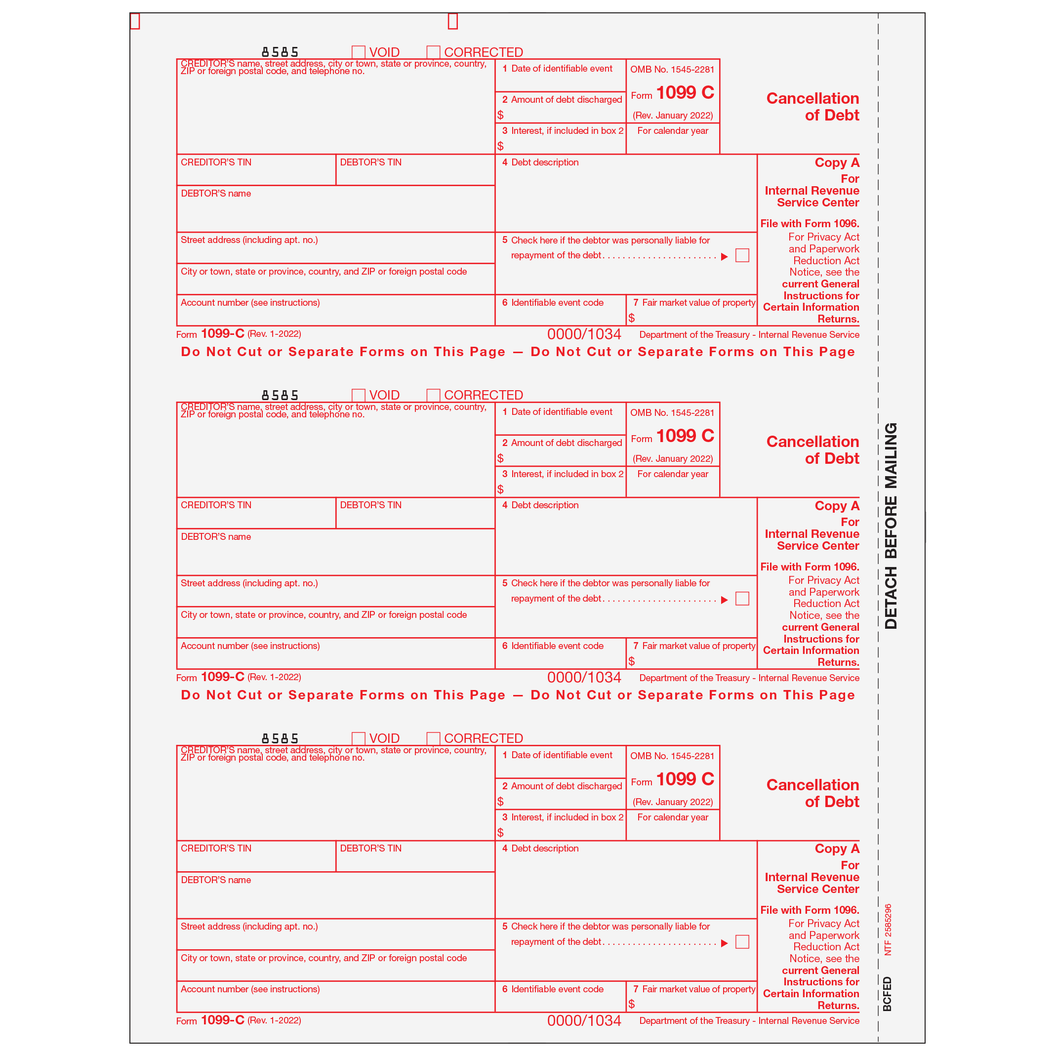 Cancellation of Debt. UseForm 1099-C Copy Ato print and mail payment information to the IRS. 1099-C Forms are 3up on an 8 1/2 x 11" sheet with a 1/2" side perforation and are printed on 20# laser paper. Mail in a batch to the IRS. Order by number of forms, not sheets.