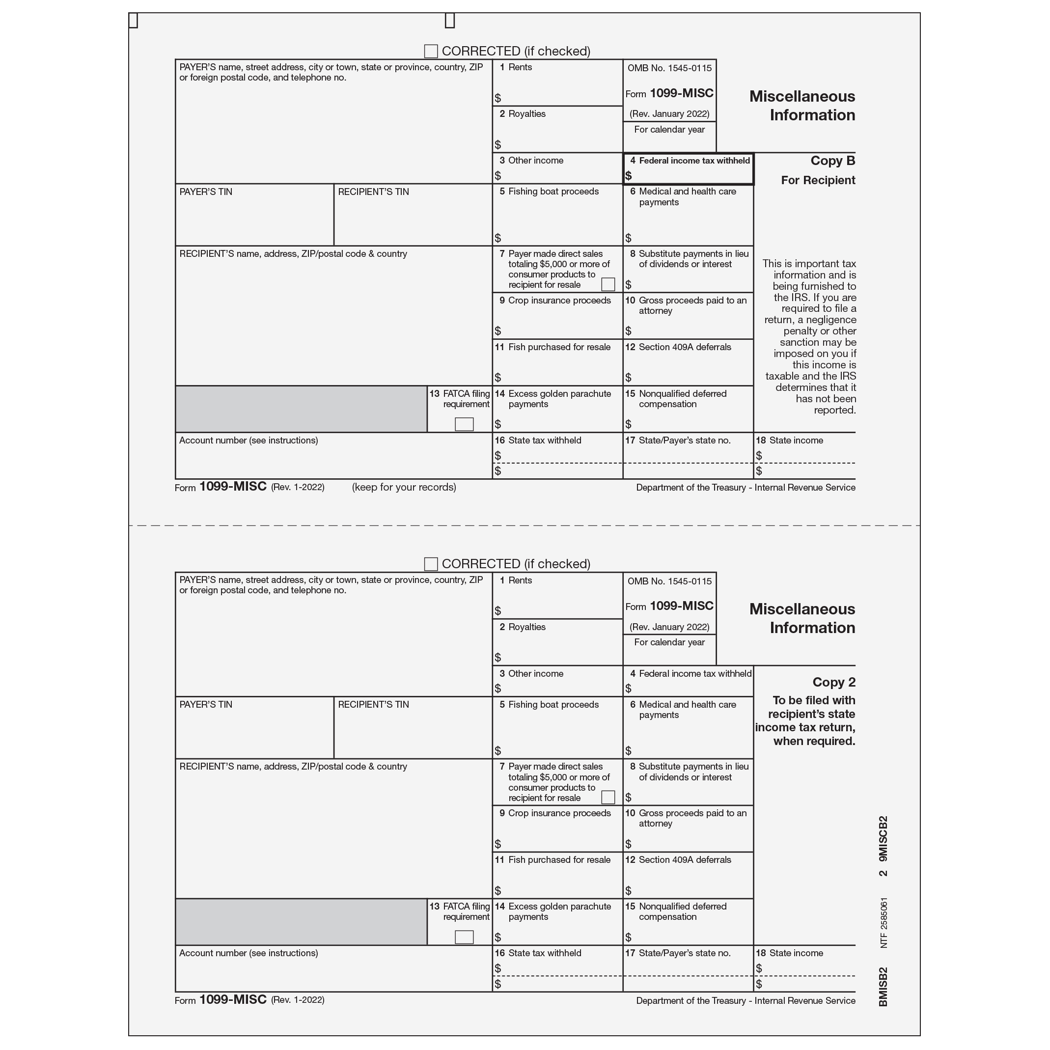 Miscellaneous Income. Use Form 1099-MISC to print and mail to the recipient. The 1099-MISC Forms are 2up format (Recipient Copy B and State Copy 2). Instructions are on back of Copy B. Check your software for compatibility with 2 copies per page for same recipient. Mail in compatible window envelopes. Order based on the number of recipients.