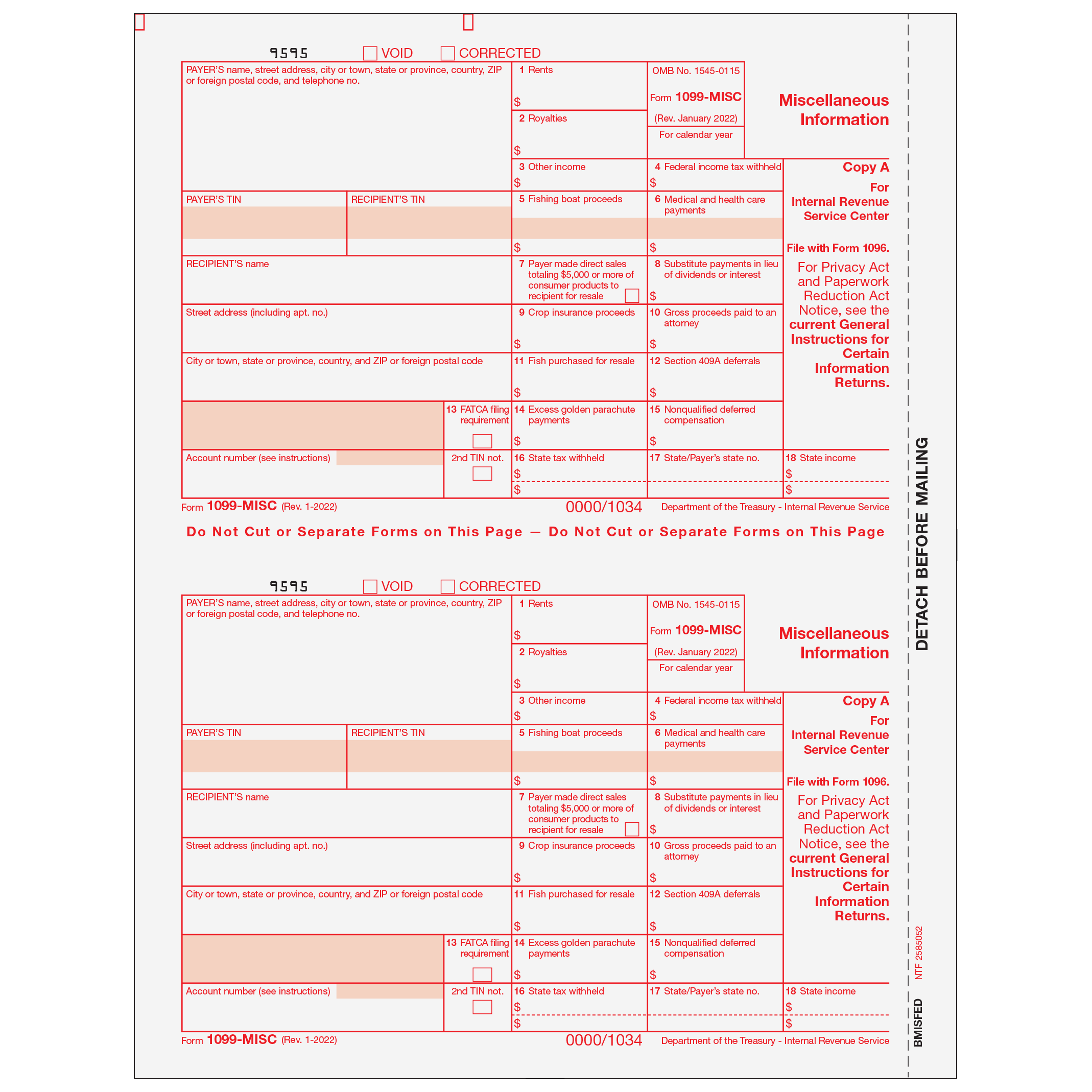 Miscellaneous Information. Use Form 1099-MISC Copy A to print and mail payment information to the IRS. 1099-MISC forms are printed in a 2-up format, on 8 1/2" x 11" paper with 1/2" side perforation, and are printed on 20# laser paper. Order by number of forms, not sheets.