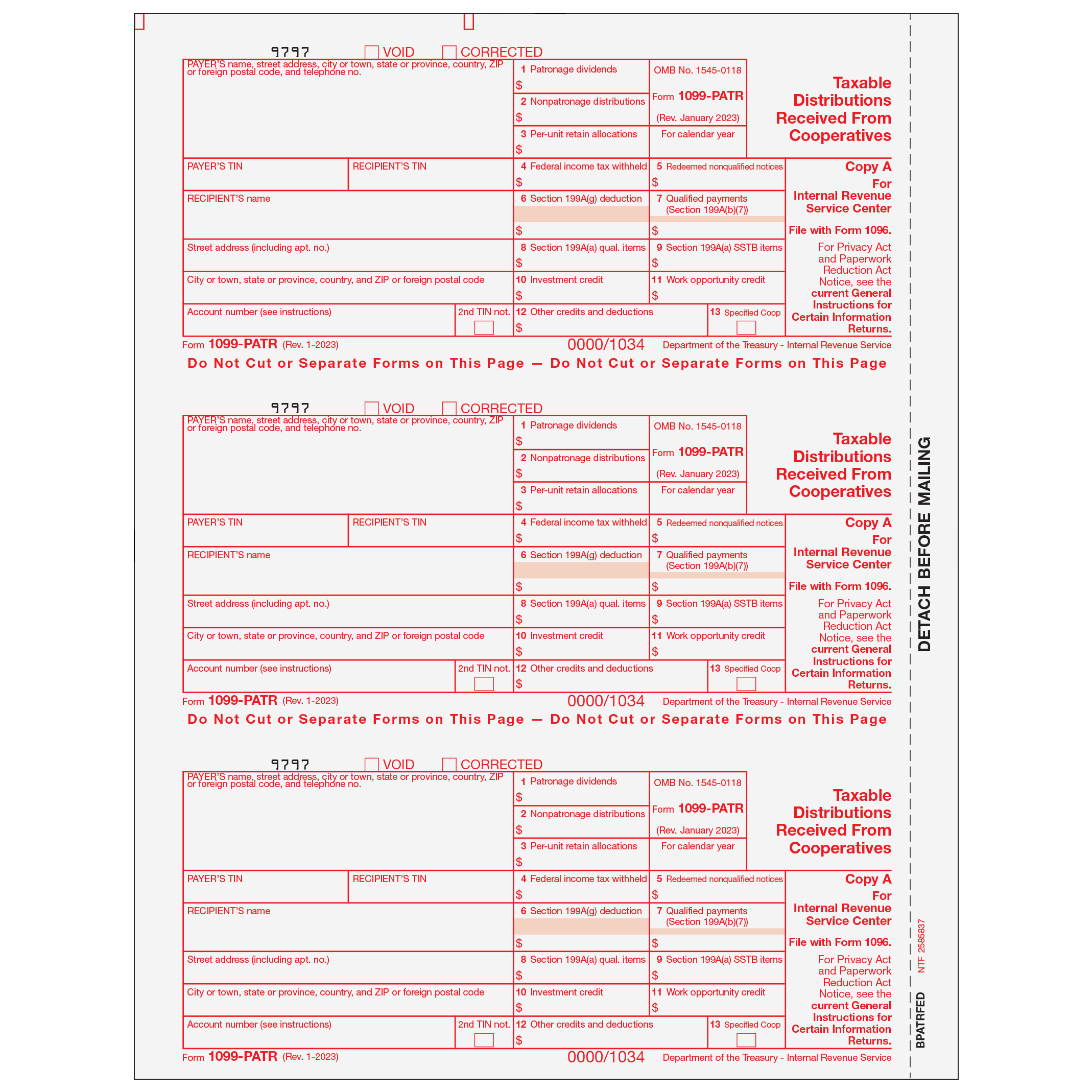 Taxable Distributions From Cooperatives. Use Form 1099-PATR Copy A to print and mail payment information to the IRS. 1099-PATR Forms are 3up on an 8 1/2 x 11" sheet with a 1/2" side perforation and are printed with red scannable ink on 20# laser paper. Mail in a batch to the IRS. Order by number of forms, not sheets.