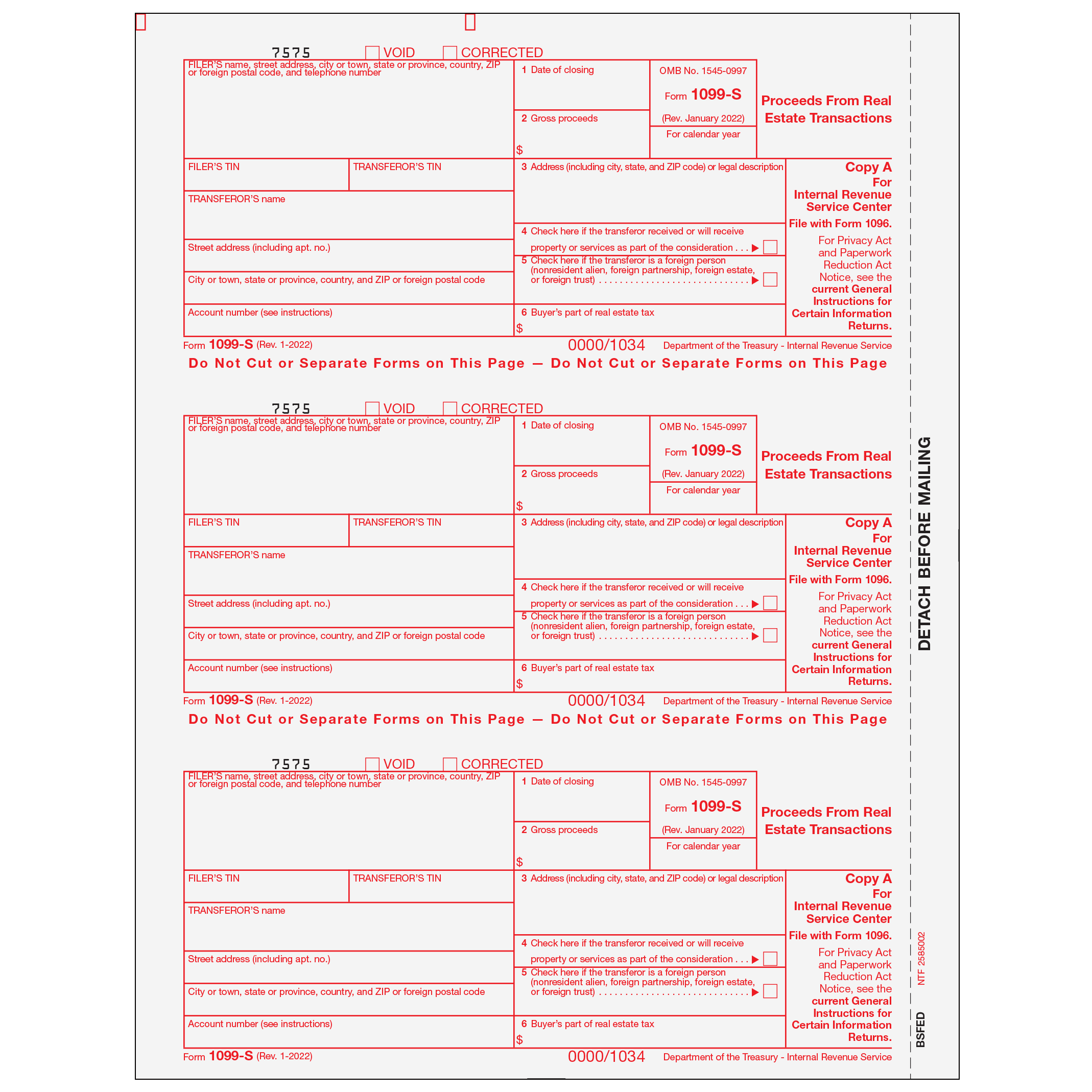 Form 1099-S - Proceeds from Real Estate Transactions. Use Form 1099-S Copy Ato print and mail payment information to the IRS. 1099-S Forms are 3up on an 8 1/2 x 11" sheet with a 1/2" side perforation and are printed with red scannable ink on 20# laser paper. Mail in a batch to the IRS. Order by number of forms, not sheets.