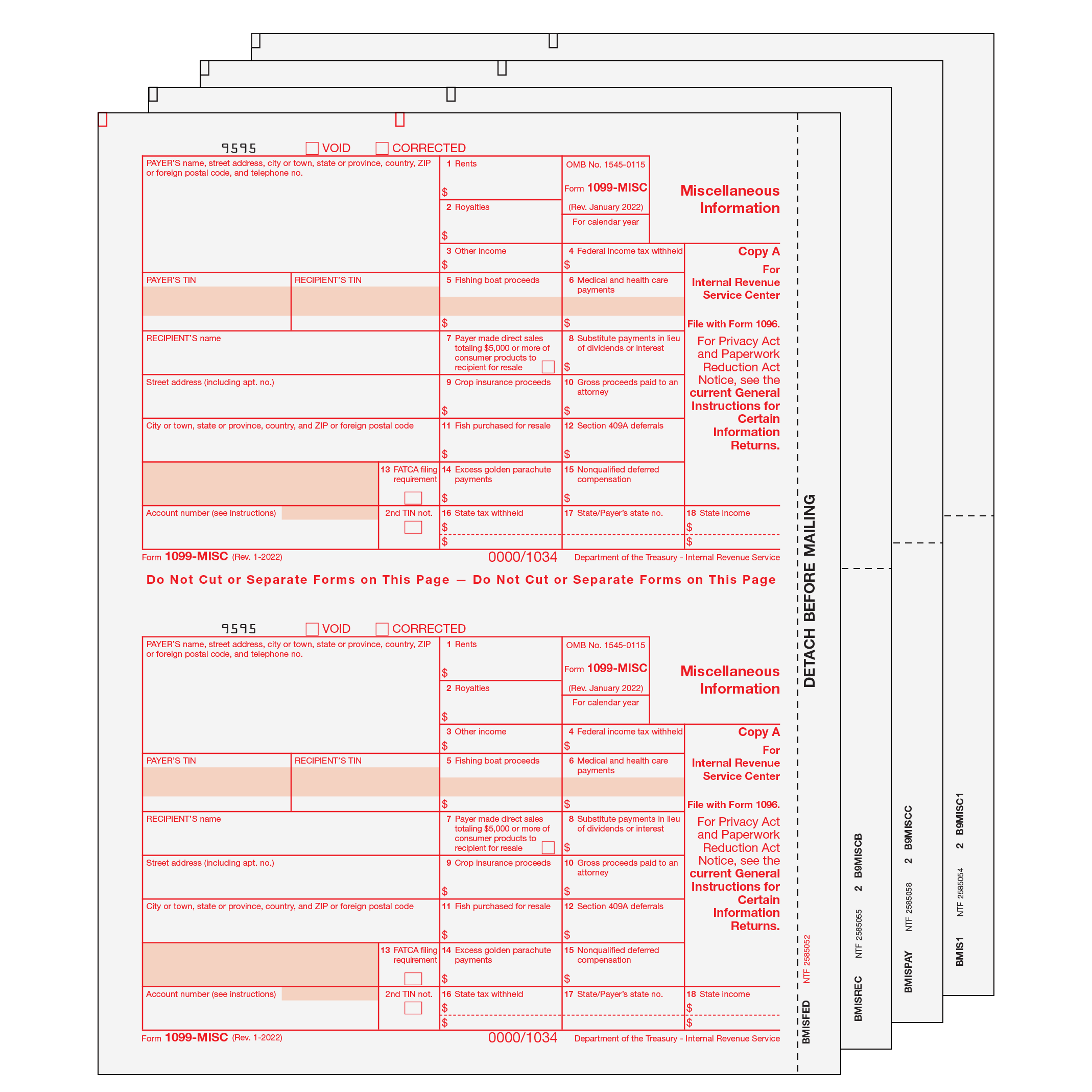 Copy A has a side perforation. Print each copy as a batch then separate and collate by recipient. Mail federal copies in a batch to the IRS. Mail recipient copies in compatible window envelopes. Order by number of forms, not sheets.