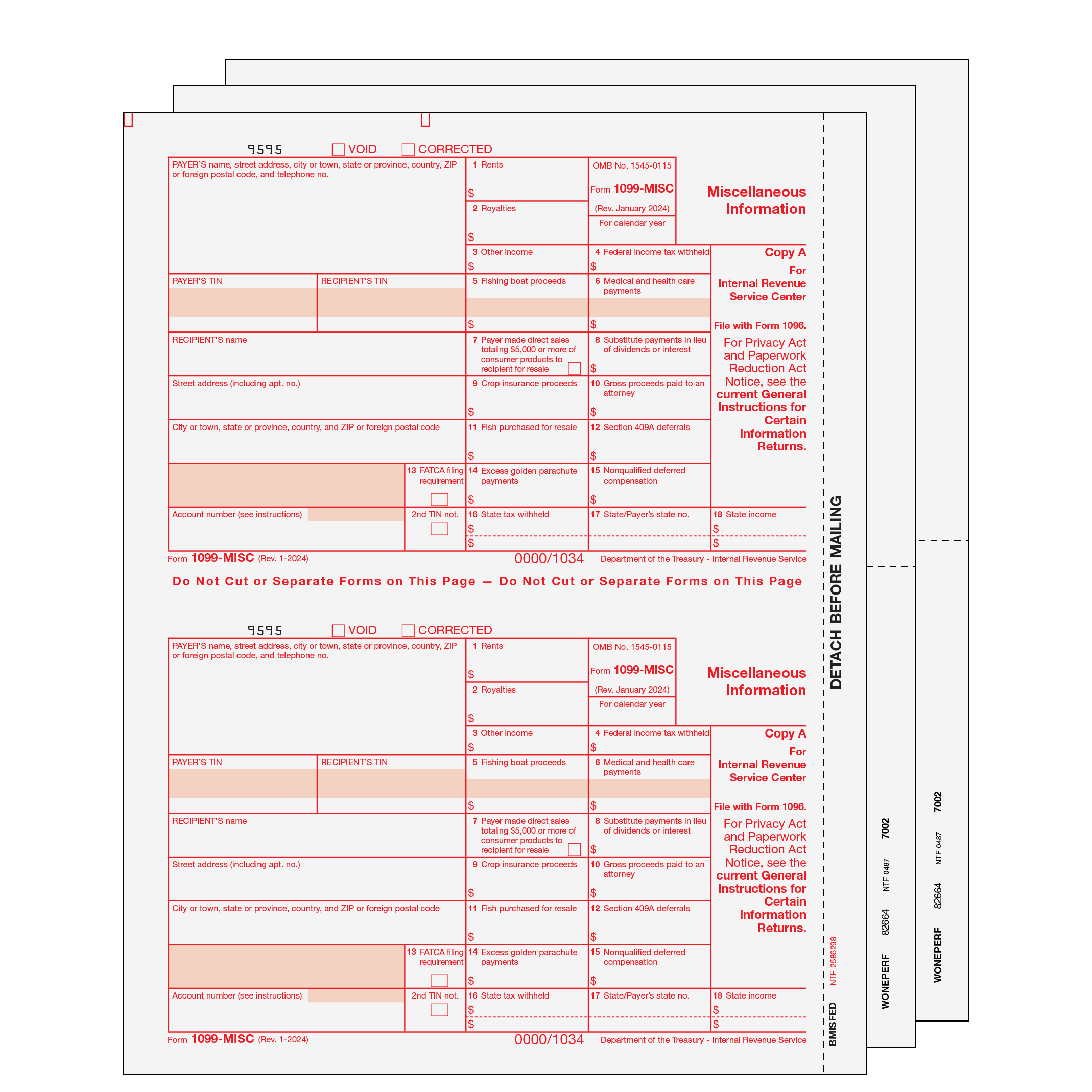 All 8 1/2 x 11" sheets are printed on 20# laser paper; Copy A has a 1/2" side perforation. Print each copy as a batch, then separate and collate by recipient. Mail payer copies in a batch to the IRS and state. Mail recipient copies in compatible window envelopes. Order by number of forms, not sheets.