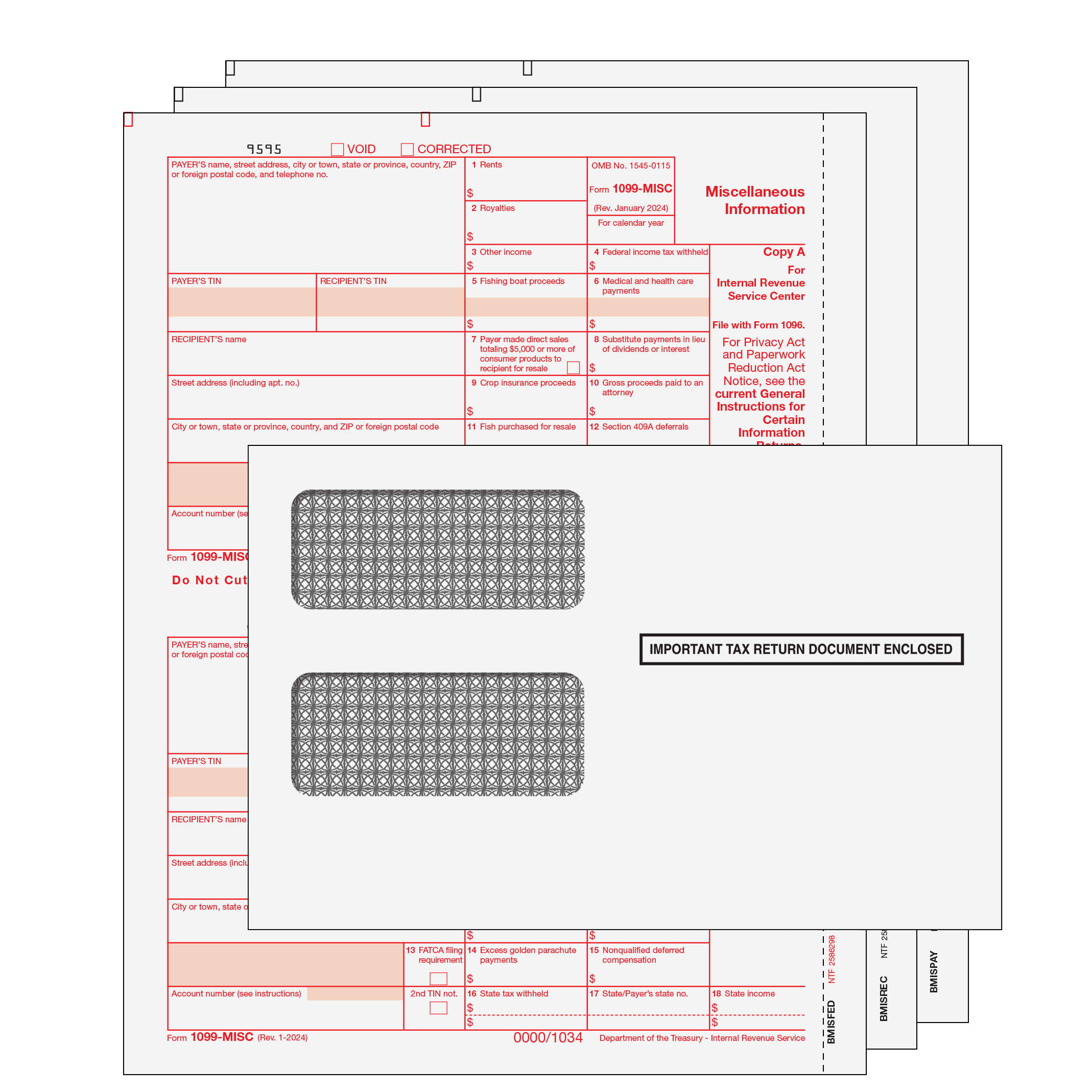 Copy A has a 1/2" side perforation. Print each copy as a batch, then separate and collate by recipient. Mail federal copies in a batch to the IRS. Mail recipient copies in included moisture seal envelope. Order by number of forms, not sheets.