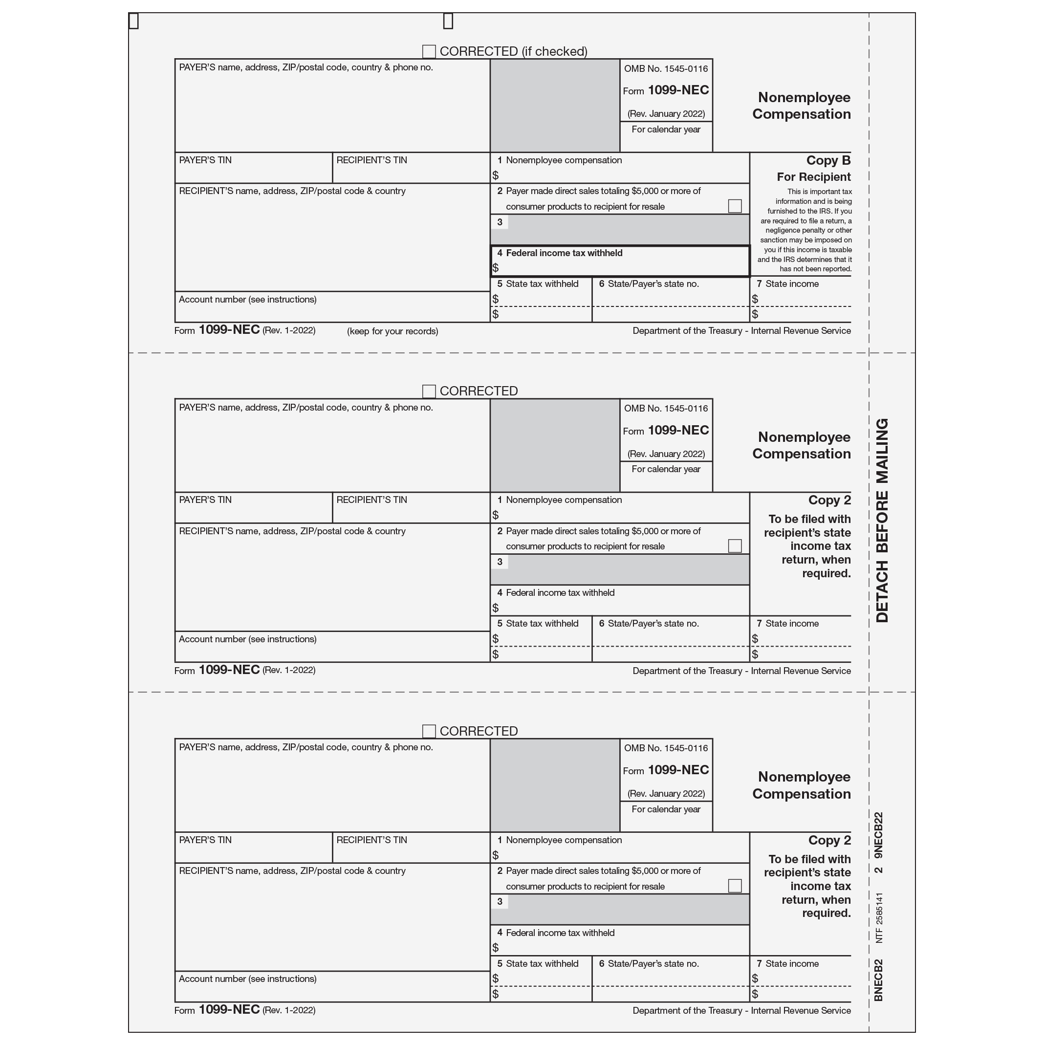 Non-Employee Compensation. Use Form 1099-NEC to print and mail to the recipient. The 1099-NEC Forms are 3up format (Recipient Copy B, State Copy 2 and State Copy 2). Instructions are on back of Copy B. Check your software for compatibility with 3 copies per page for same recipient. Mail in compatible window envelopes. Order based on the number of recipients.