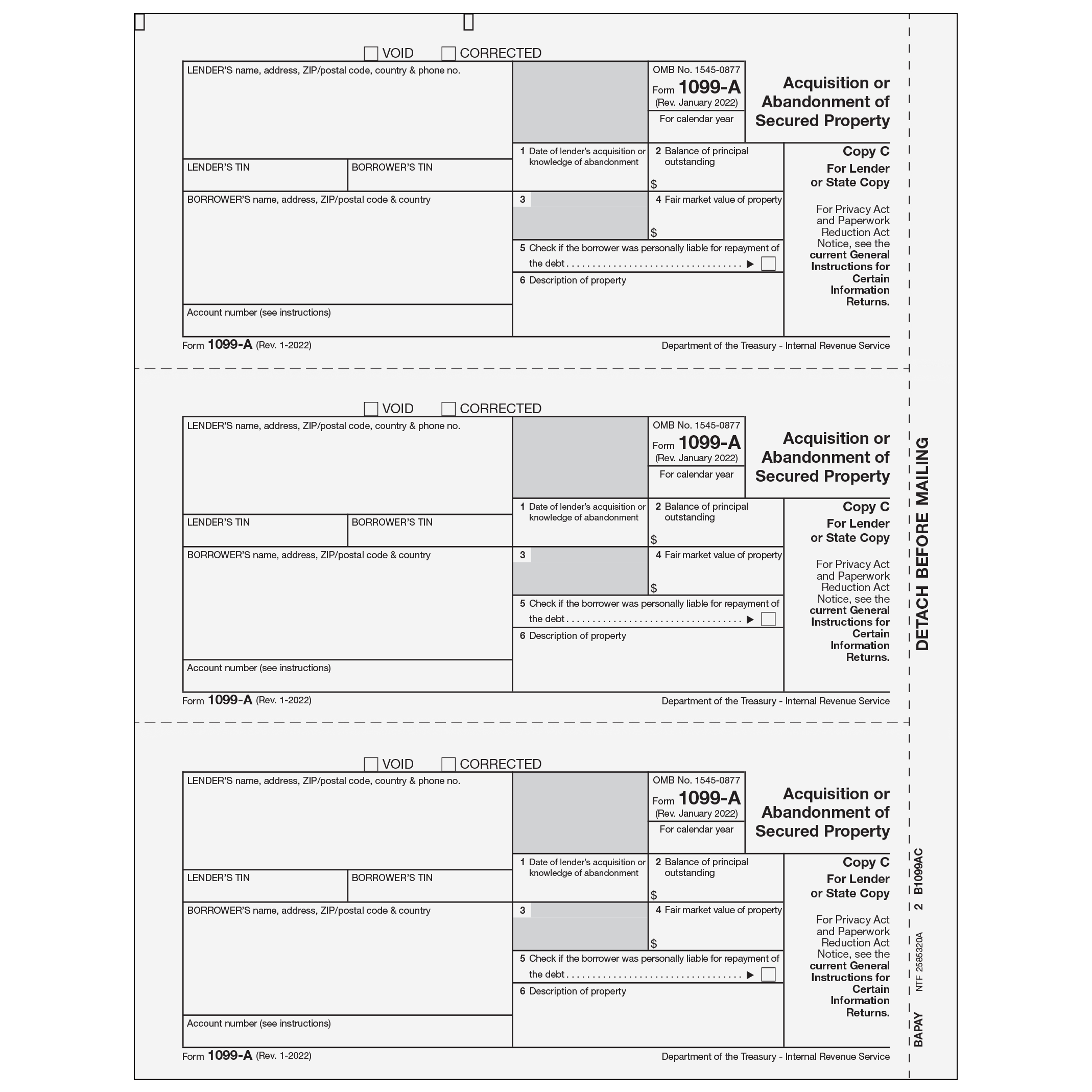 Acquisition or Abandonment of Secured Property. UseForm 1099-A Copy Cto print and mail payment information to the state or for lender's records. 1099-A Forms are 3-up on an 8 1/2 x 11" sheet with a 1/2" side perforation and are printed on 20# laser paper. Mail in a batch to the state or keep as file copies. Order by number of forms, not sheets.