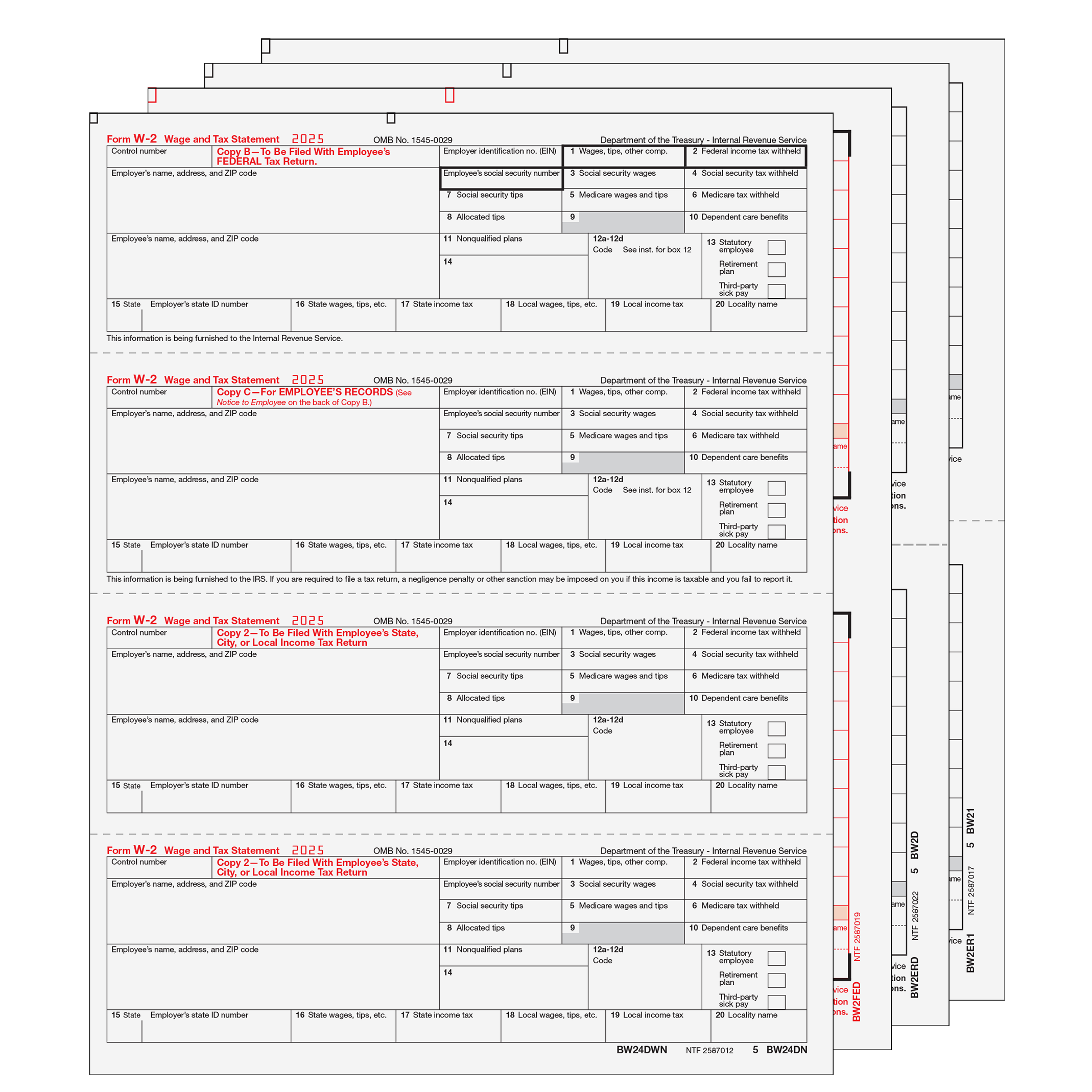 Employee copies B/C/2/2 come on a 4-up horizontal form. Employer copies are all on a 2-up form. Print each copy as a batch, then fold and mail recipient copies. No collating or separating needed! Mail employer copies in a batch to the SSA and state. Order by number of forms, not sheets.