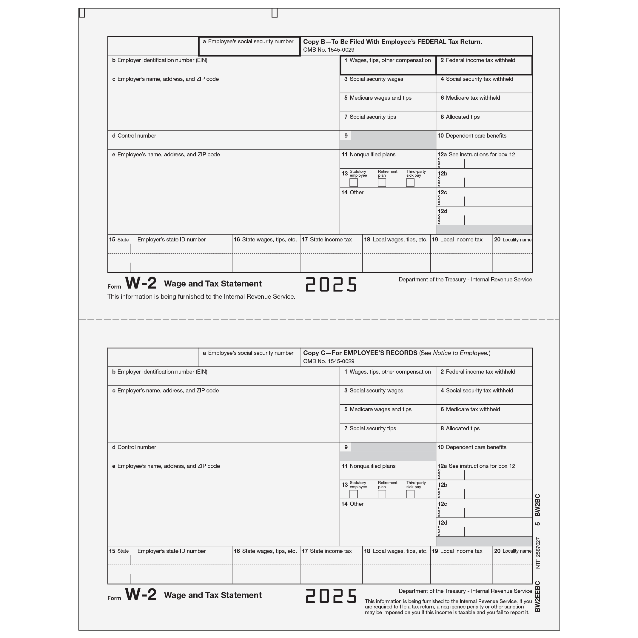 Form W-2 - Wage & Tax Statement Use the condensed Form W-2 2-Up to print employee W-2 Copies B and C (federal and record). Print all employee copies on the same sheet, fold and mail. Eliminate separating and collating forms! W-2 forms are 2-up on a sheet and preprinted in black ink. Check your software for condensed 2-up compatibility. Order by the sheet.