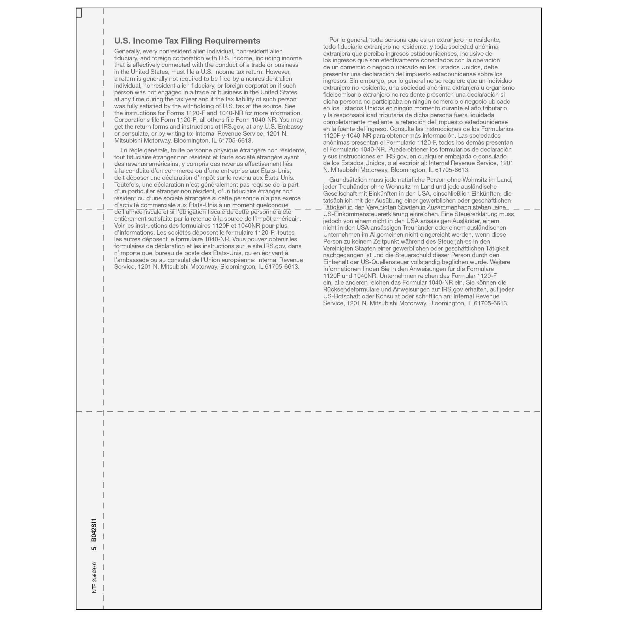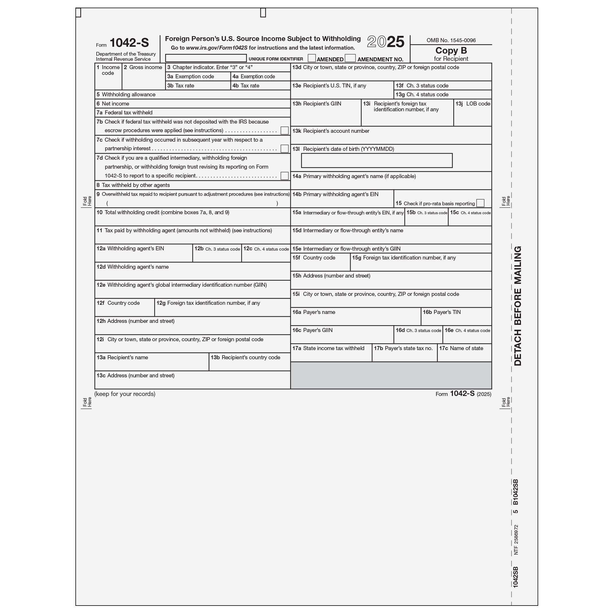 Foreign Person's U.S. Source Income Subject to Withholding. Use Form 1042-S Copy B to print and mail payment information to the recipient for their file copy. 1042-S forms are printed in a 1-up format, on 8 1/2" x 11" paper with 1/2" side perforation, and are printed on 20# laser paper. Order based on the number of recipients.
