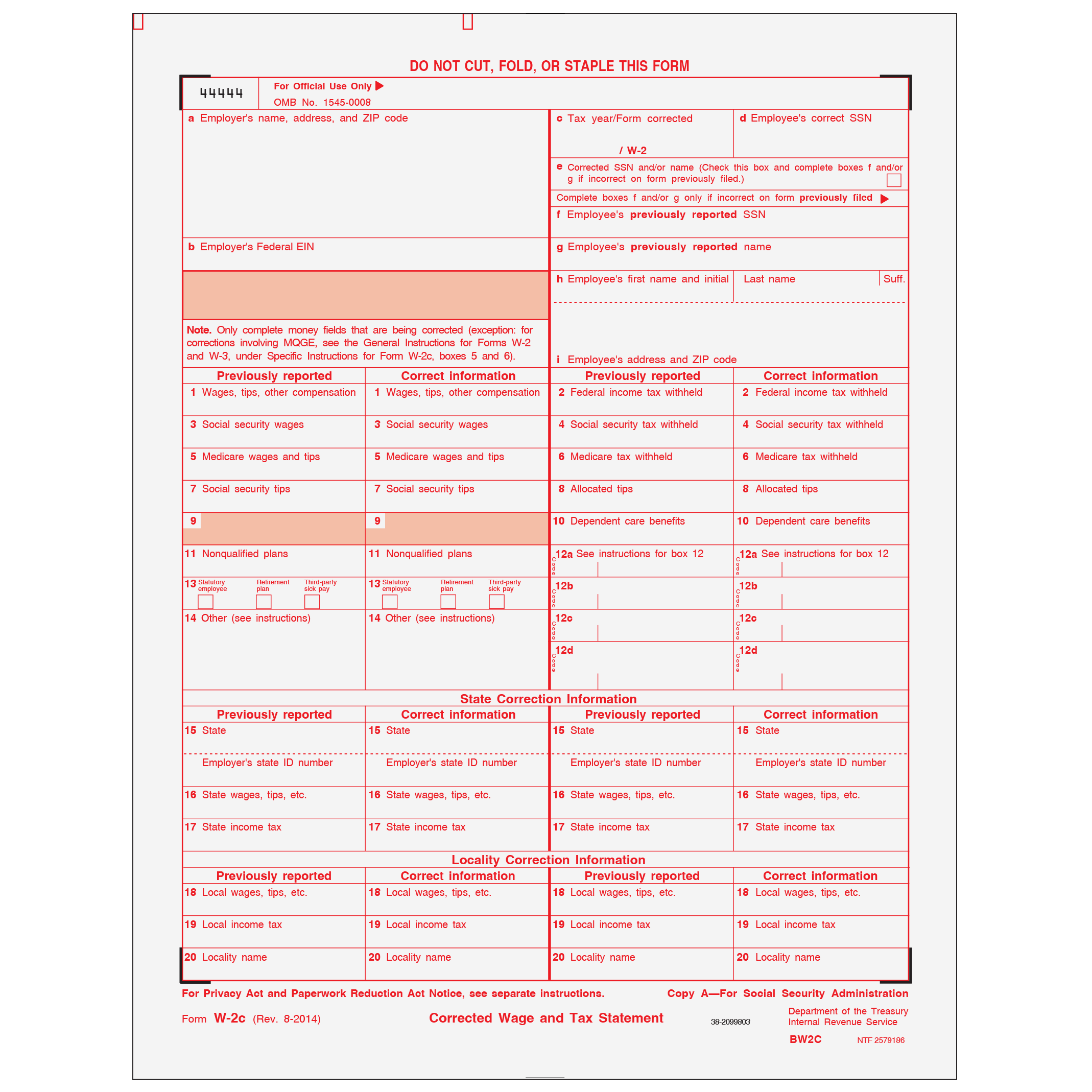 Form W-2C - Corrected Wage & Tax Statement. Use the W-2C form to correct information filed on the original W-2 form. Forms are 1-Up sheets with no side perforations and are preprinted with red ink. Use Copy A for federal filing. You fill in the year you are correcting. W-2C is summarized by W-3C. Order by the sheet.
