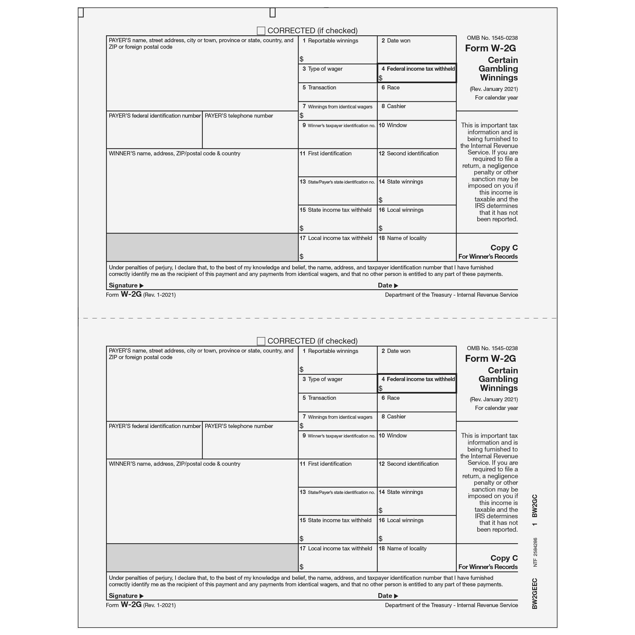 Form W-2G - Wage & Tax Statement. Use Form W-2G Copy C to print certain gambling winnings for the employee's records. W-2 forms are preprinted with black ink, 2-up on a sheet with no side perforation. Prints 2 employees per page. Split and collate and insert in compatible envelopes. Order by number of forms, not sheets.