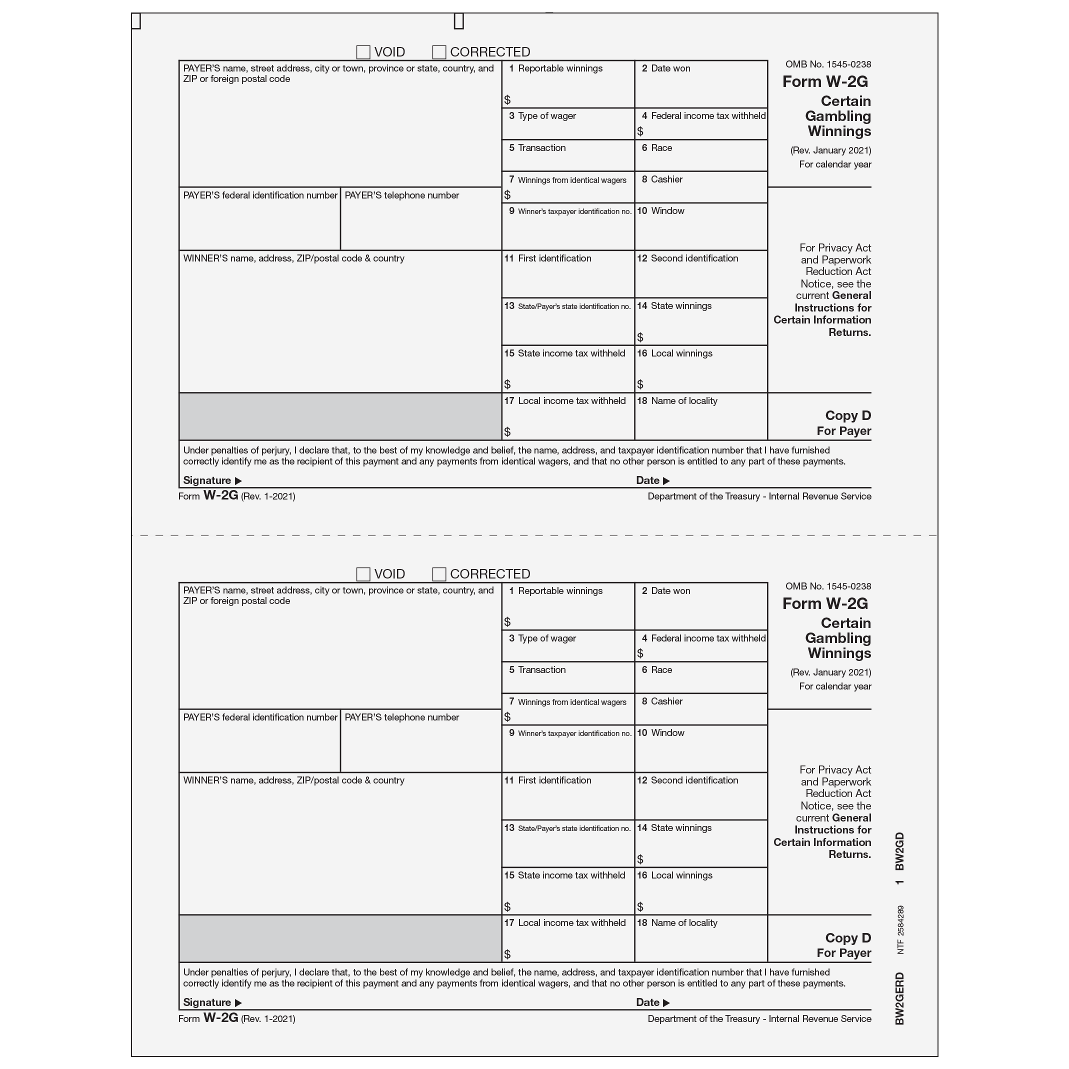 Form W-2G - Certain Gambling Winnings. Use Form W-2G Copy D to print payer record copies. W-2G forms are preprinted with black ink, 2-up on a sheet with no side perforation. Order by number of forms, not sheets.