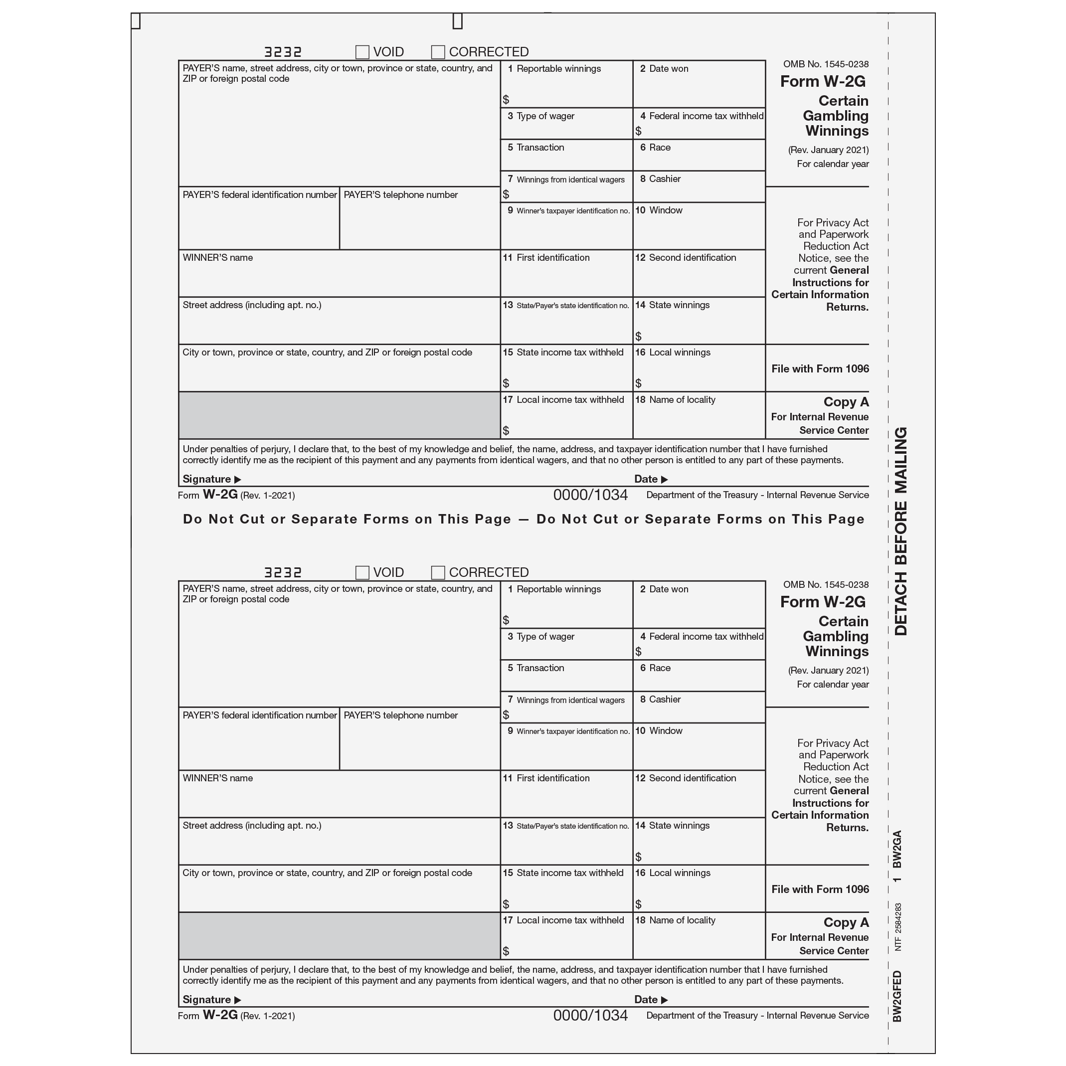Form W-2G - Wage & Tax Statement. Use Form W-2G Copy A to print certain gambling winnings for payer submission to SSA. This form is preprinted with black ink. Per SSA specifications, copy A does not have a horizontal perforation. 2 employees per page. Order by number of forms, not sheets.