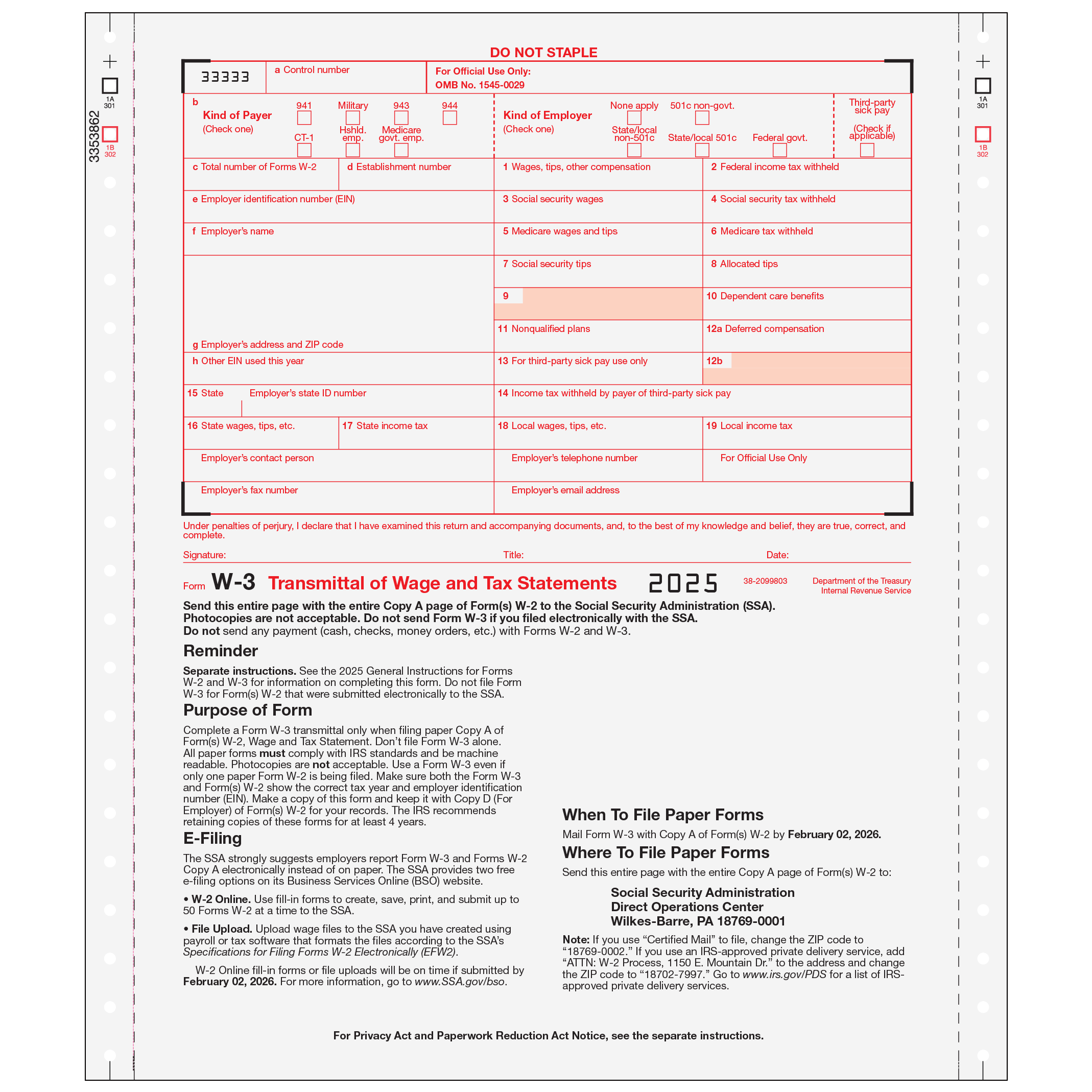 Form W-3 - Transmittal of Wage and Tax Statement. Use the W-3 form (Transmittal of Wage and Tax Statements) to summarize W-2 information for the SSA. You must complete one W-3 form for each employer. Forms do not have perforations and are required to be preprinted with red scannable ink. Mail with the W-2 Copy A in a batch to the SSA. Order by the sheet.